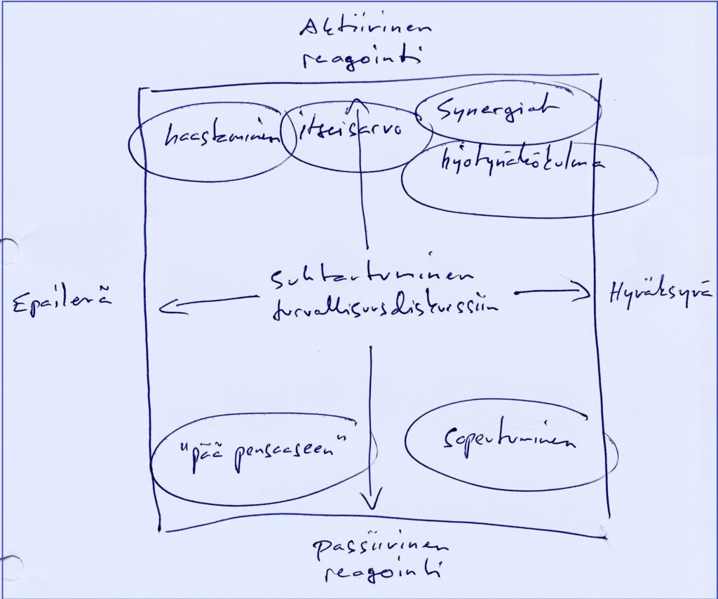 Kuten kuvasta hahmottuu, passiivinen reagointi yhdistettynä turvallisuusdiskurssin relevanssin epäilyyn tarkoittaa organisaation nykyisen kestävyystyön jatkamista, ehkä pienemmällä volyymillä ja huomiolla, omaan asiaa keskittyneenä. Passiivinen reagointi yhdistettynä turvallisuusdiskurssin relevanssin hyväksymiseen tarkoittaa puolestaan kestävyystyön sopeuttamista turvallisuusdiskurssista kumpuaviin vaatimuksiin. Esimerkiksi maataloudessa tämä tarkoittaisi ruokaturvan ja omavaraisuuden painottamista ruuantuotannon ympäristökestävyyden sijasta.